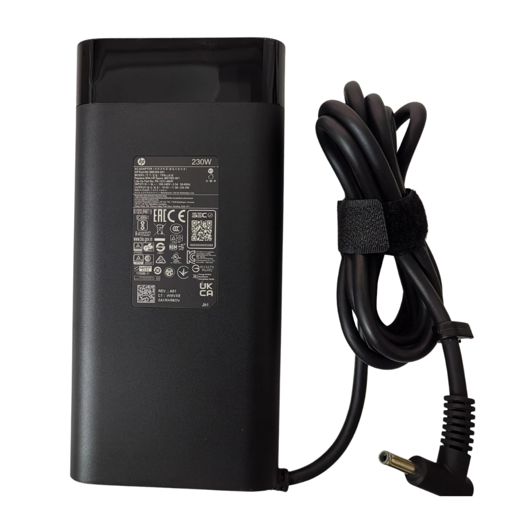 شاحن HP أصلي 230 واط Blue Tip — رقم القطعة TPN-LA10 / TPN-DA12 / M41303-001 — خرج 19.5V / 11.8A — موصل 4.5×3.0mm Blue Tip. يعمل مع HP OMEN 15 / 16 وOMEN Transcend 16 وZBook Fury 15/16 وVictus 15 / 16 وأي جهاز HP يستخدم 230 واط / 19.5V / موصل 4.5×3.0mm Blue Tip. تأكد أن منفذ الشحن في لابتوبك 4.5×3.0mm قبل الشراء (غير متوافق مع موصل 7.4×5.0mm).