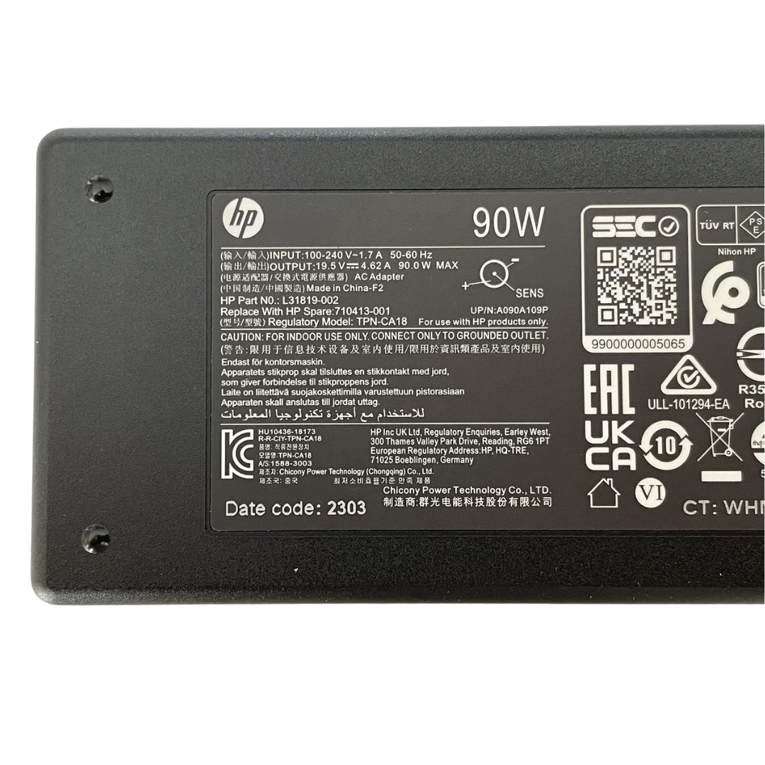 شاحن HP أصلي 90 واط — رقم القطعة TPN-CA18 / 710413-001 — خرج 19.5V / 4.62A — موصل 4.5×3.0mm Blue Tip. يعمل مع HP Pavilion 14 / 15 / 17 وHP Envy 14 / 15 / 17 وHP ProBook 430 / 440 / 450 / 640 / 650 وHP EliteBook 820 / 840 / 850 وأي جهاز HP يستخدم 90W / 19.5V / موصل 4.5×3.0mm.