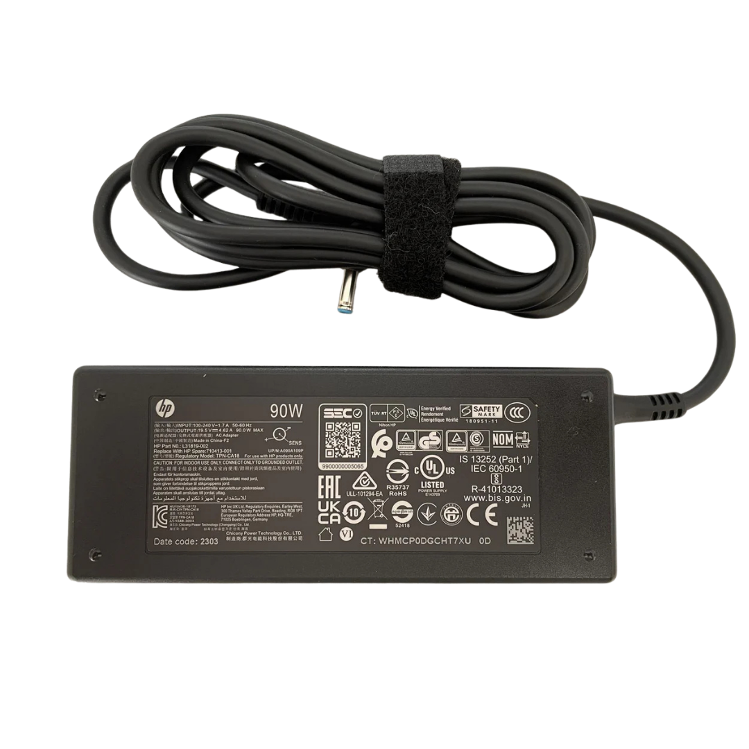 شاحن HP 90W أصلي Blue Tip برقم القطعة TPN-CA18 (يُعرف أيضاً بـ 710413-001 / TPN-DA18 / 741727-001 / L25296-001 / 937532-850) هو الشاحن الأصلي لأجهزة HP Pavilion وEnvy وProBook وEliteBook وStream وChromebook. يوفر خرج 19.5V / 4.62A مع توافق مع أجهزة 65W و45W بنفس الموصل.