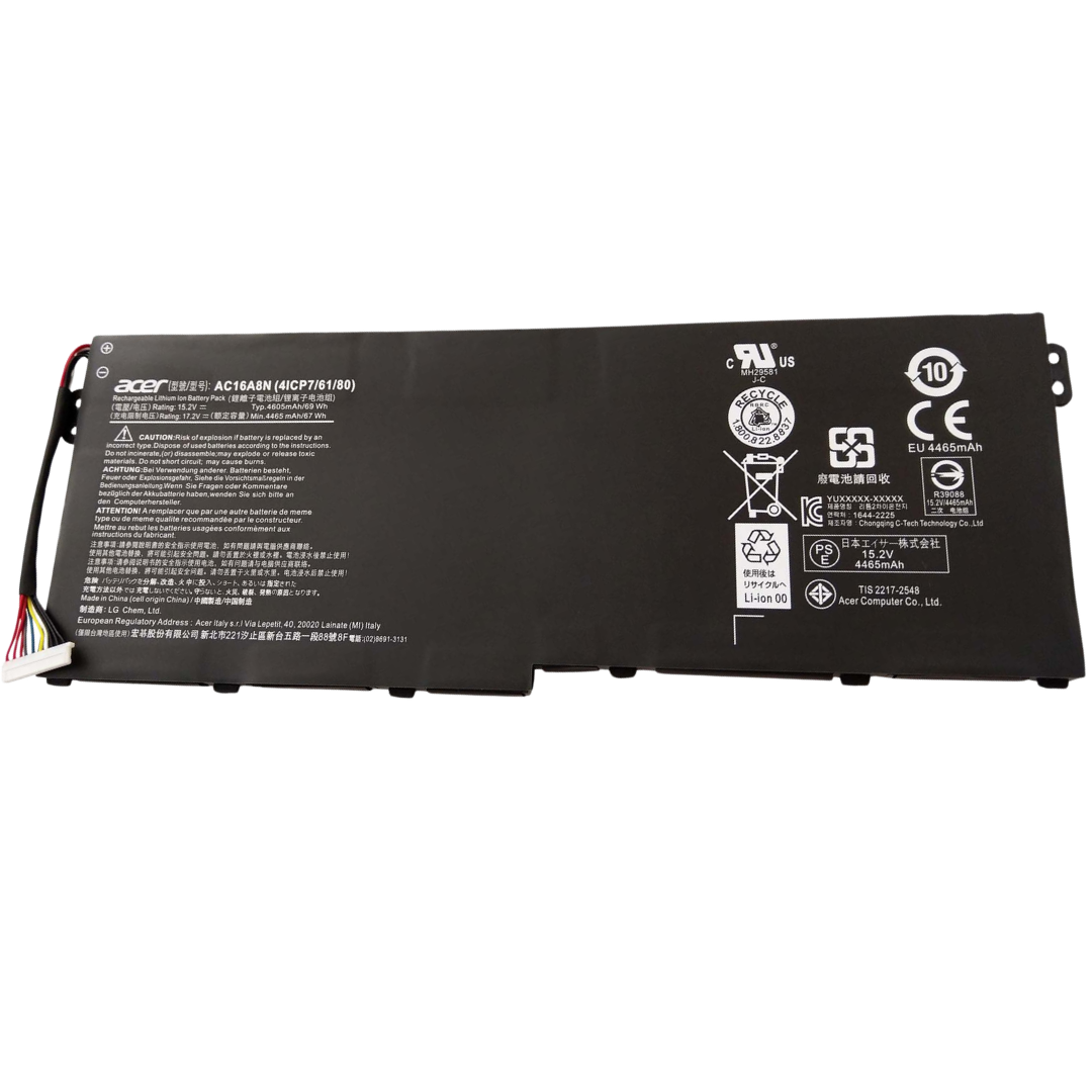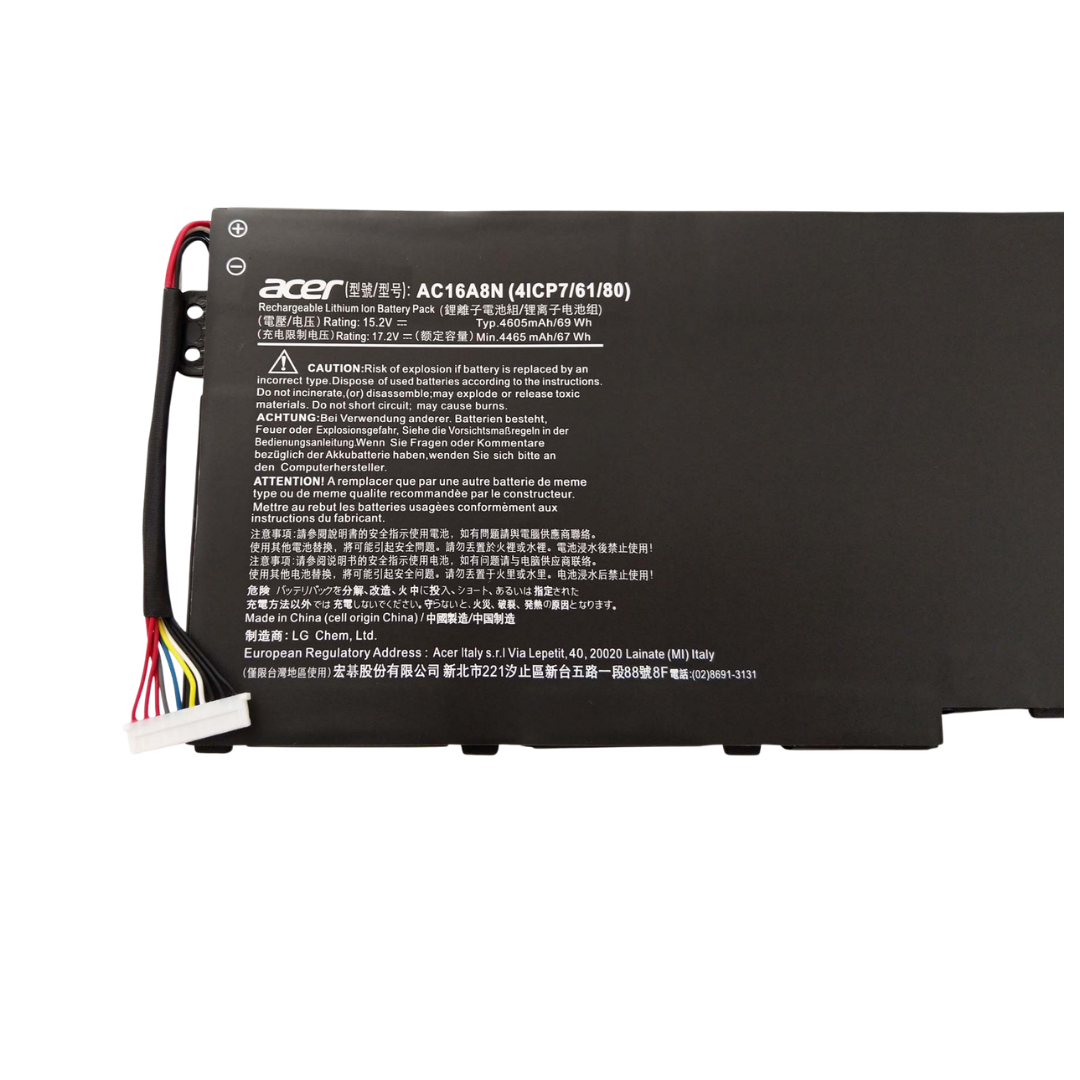بطارية Acer AC16A8N أصلية هي بطارية ليثيوم أيون بسعة 69 واط/ساعة وفولت 15.2 فولت مصممة خصيصًا لأجهزة Acer Aspire Nitro من فئة VN7. توفر طاقة مستقرة وتدعم الاستخدام اليومي والعمل والألعاب.